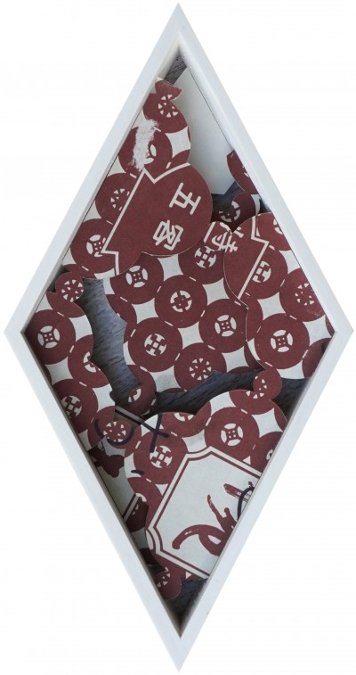 Found frame and paper, graphite, acrylic paint, cotton thread, antique frame